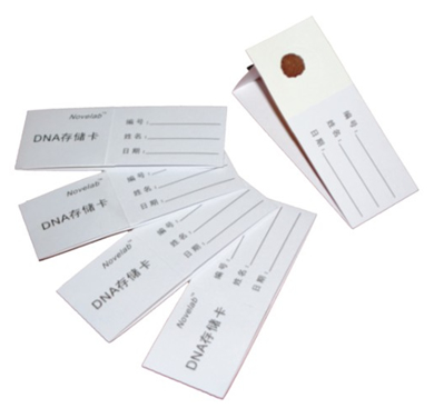 DNA storage card(DNA blood sample card) is a new medium based on vegetable fibre for DNA storage, particularly for collection, transportation and storage of different kinds of biological fluid(e.g. Blood, semen, saliva), cell culture fluid, microorganism, vegetable fibre, virus. By the distinct fomular and production engineering, this product obtains the ability of protein denaturation, cytomembrane burst, DNA adsorption and bacterialstat, and thus ensure the target DNA could be stored on the card for years without losing PCR efficacy. The safety of operation and transportation are also guaranteed since the denaturation of protein could also make pathogenic microorganism and virus lose the activity.